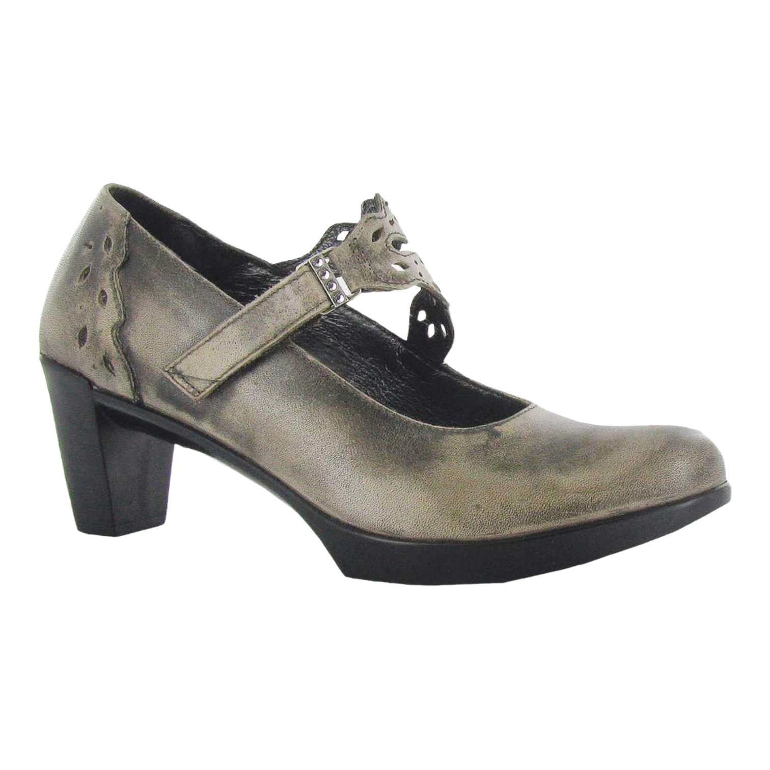 The Naot Amato is a feminine maryjane shoe with a delicate cutout leather hook & loop strap at the instep. This style has rhinestone accents on the instep strap. Naot's anatomic cork & memory foam footbed is wrapped in leather & microfiber and molds to the shape of the foot with wear. This collection uses a hand-sewn Strobel construction making it strong and extremely flexible. The Prima Bella Collection features a 2 3/4" polyurethane sole with a metal shank.