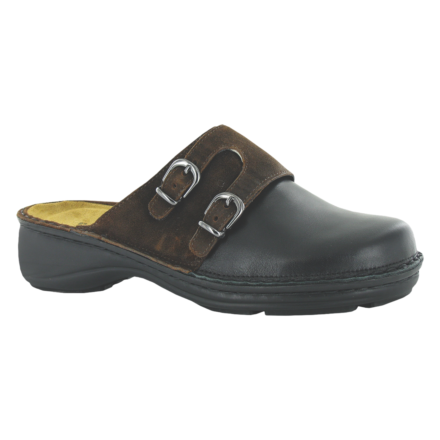 The Leilani is a great everyday comfort clog. This style has a hook and look with faux buckles and contrasting leathers. Naot's removable, anatomic cork & latex footbed is wrapped in pampering suede and molds to the shape of the foot with wear. The Floral Collection features a 1.5" polyurethane sole with a metal shank and is extremely lightweight and durable.