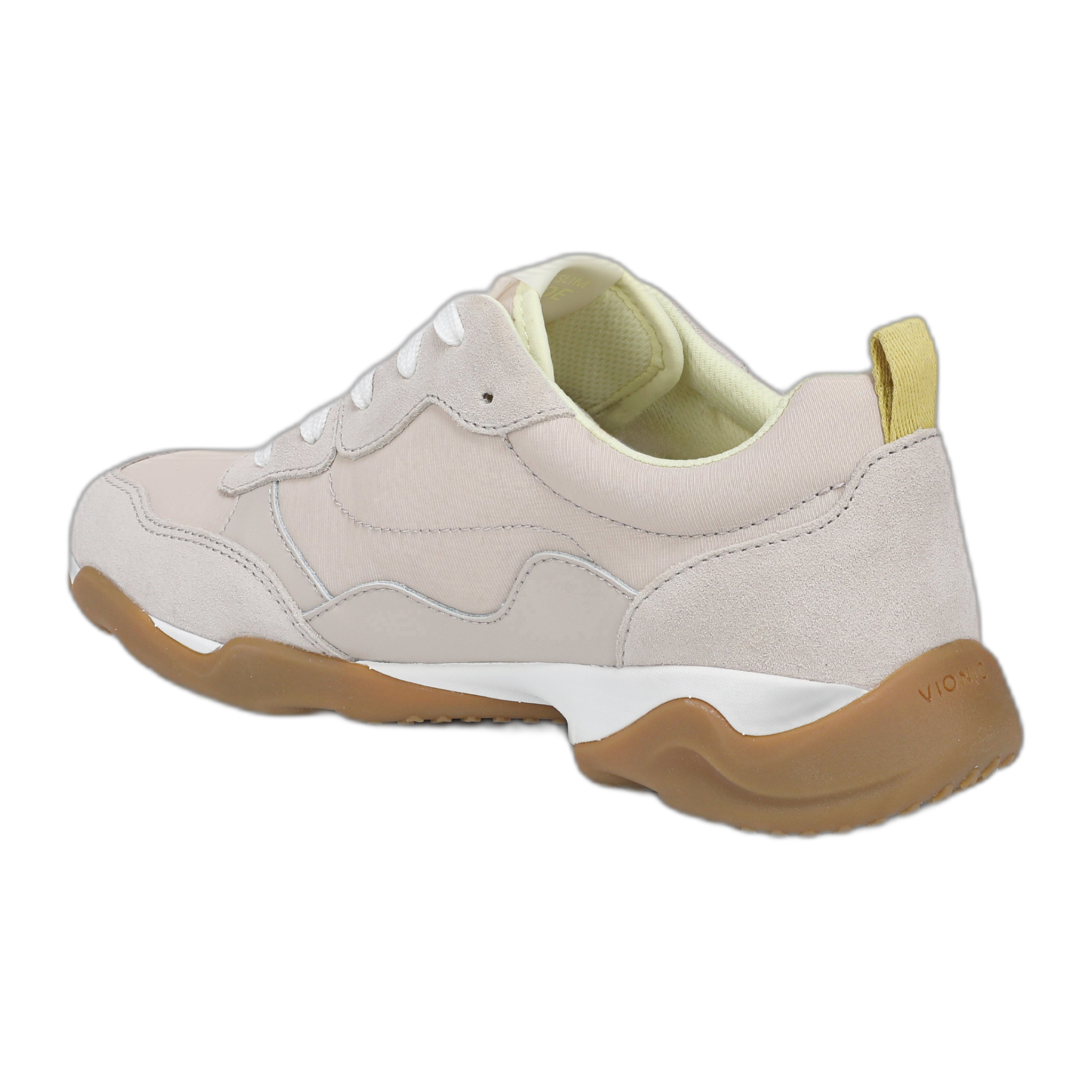 Style-forward comfort with proven performance. Casual yet sophisticated, the Walk Slim Glide pairs retro-inspired nylon and suede uppers with the exact trusted technology and support found in our #1 performance walking shoe. Featuring a breathable, contoured Vio Flex footbed, a supportive nylon midsole shank, and a low-profile compression molded EVA midsole, it delivers all-day cushioning and stability. Finished with Vionic’s signature V tread wrap-up rubber outsole for durable traction, this sleek lace-up sneaker offers the perfect blend of fashion and function. A biomechanically designed footbed for comfort that keeps you in motion. . Built-in VIO MOTION Technology footbed featuring contoured arch support, with shock-absorbing cushioning, deep heel cup to provide stability, and forefoot flexibility. The exclusive alignment technology balances the whole you.