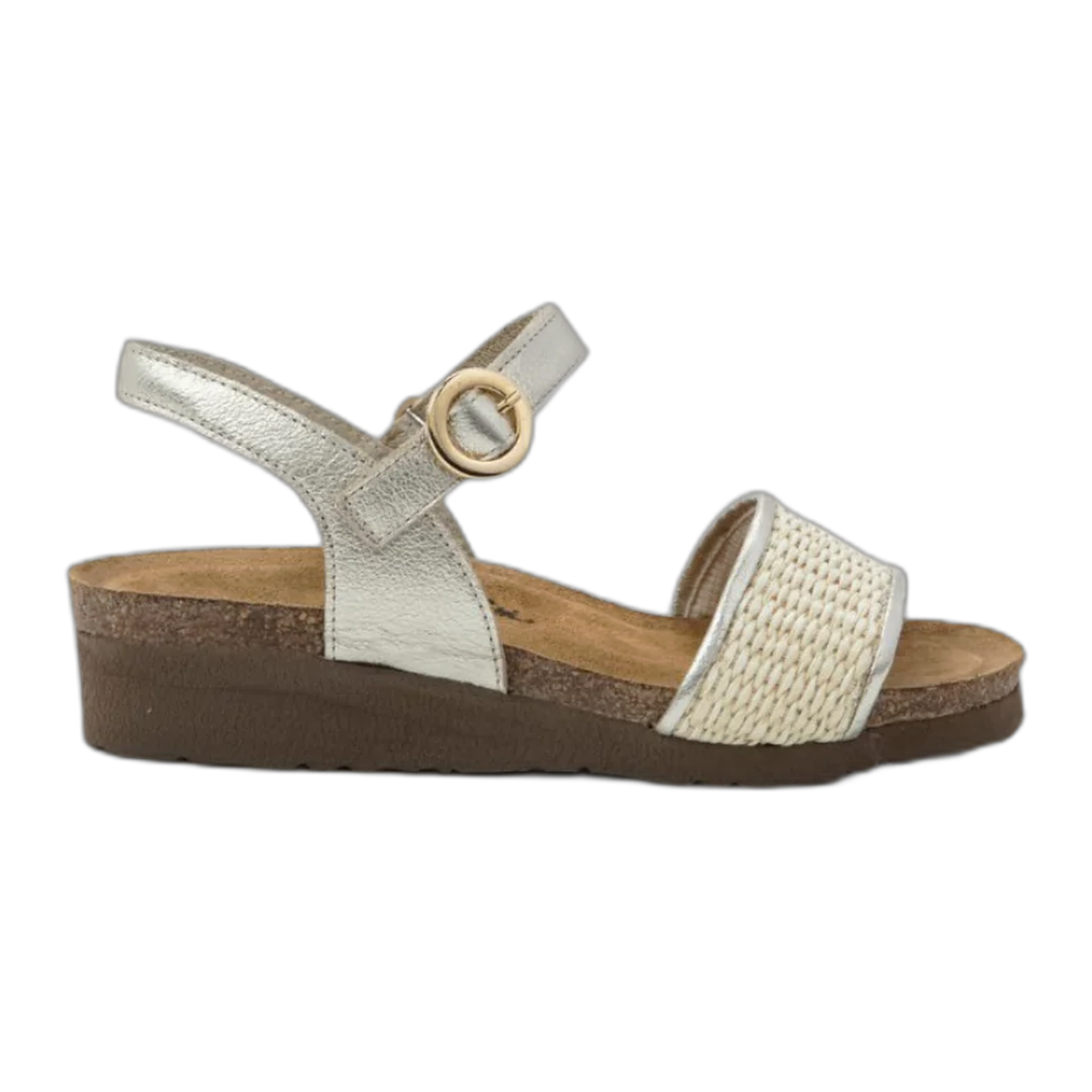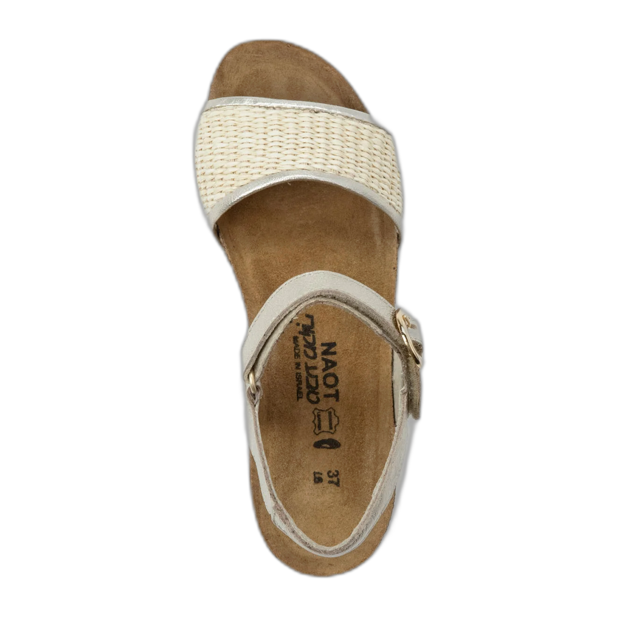 Meet Cecile - the perfect harmony of comfort and elegance. This backstrap sandal boasts a chic design with a faux buckle hook and loop strap and raffia detailing on the front strap, adding a touch of natural charm to any ensemble. The adjustable closure provides ease and convenience, ensuring you never have to sacrifice style for comfort. Cecile is the ideal choice for any occasion. Crafted with Naot's anatomic cork and latex footbed wrapped in pampering suede and molds to the shape of your foot with wear, ensuring personalized comfort. Plus, it's accepted by the American Podiatric Medical Association (APMA) for promoting good foot health. The Elegant Collection's 1.5" EVA sole offers both elegance and support.