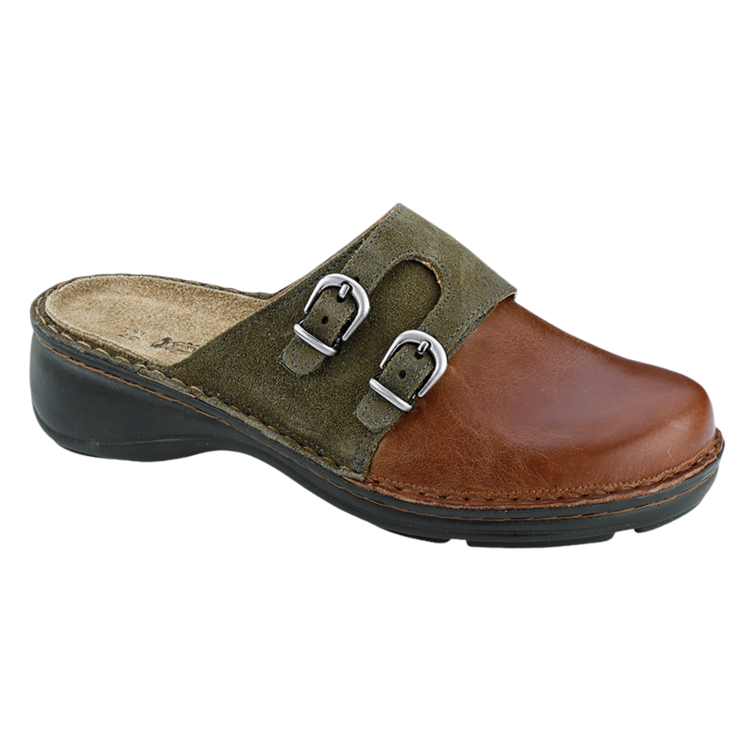 The Leilani is a great everyday comfort clog. This style has a hook and look with faux buckles and contrasting leathers. Naot's removable, anatomic cork & latex footbed is wrapped in pampering suede and molds to the shape of the foot with wear. The Floral Collection features a 1.5" polyurethane sole with a metal shank and is extremely lightweight and durable.
