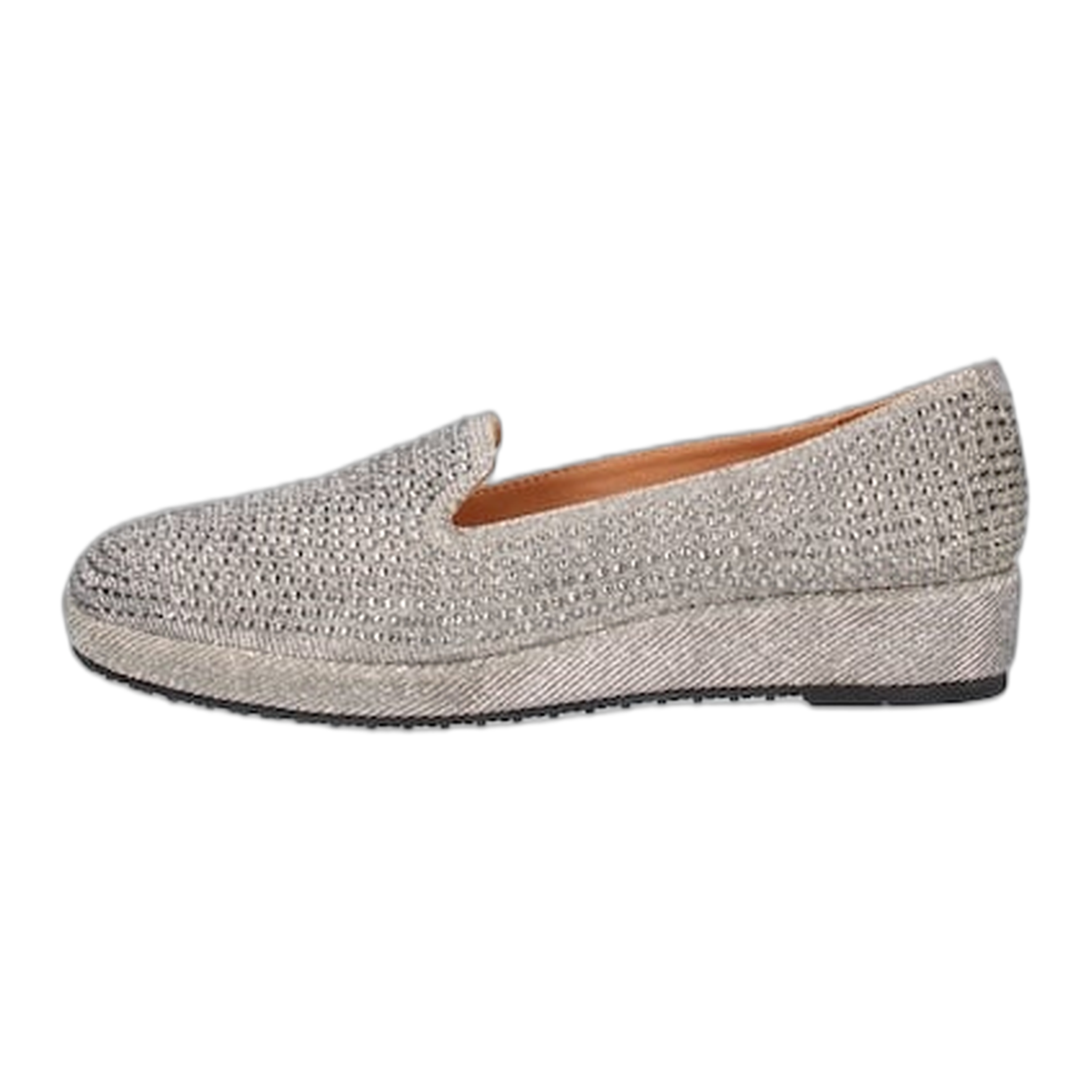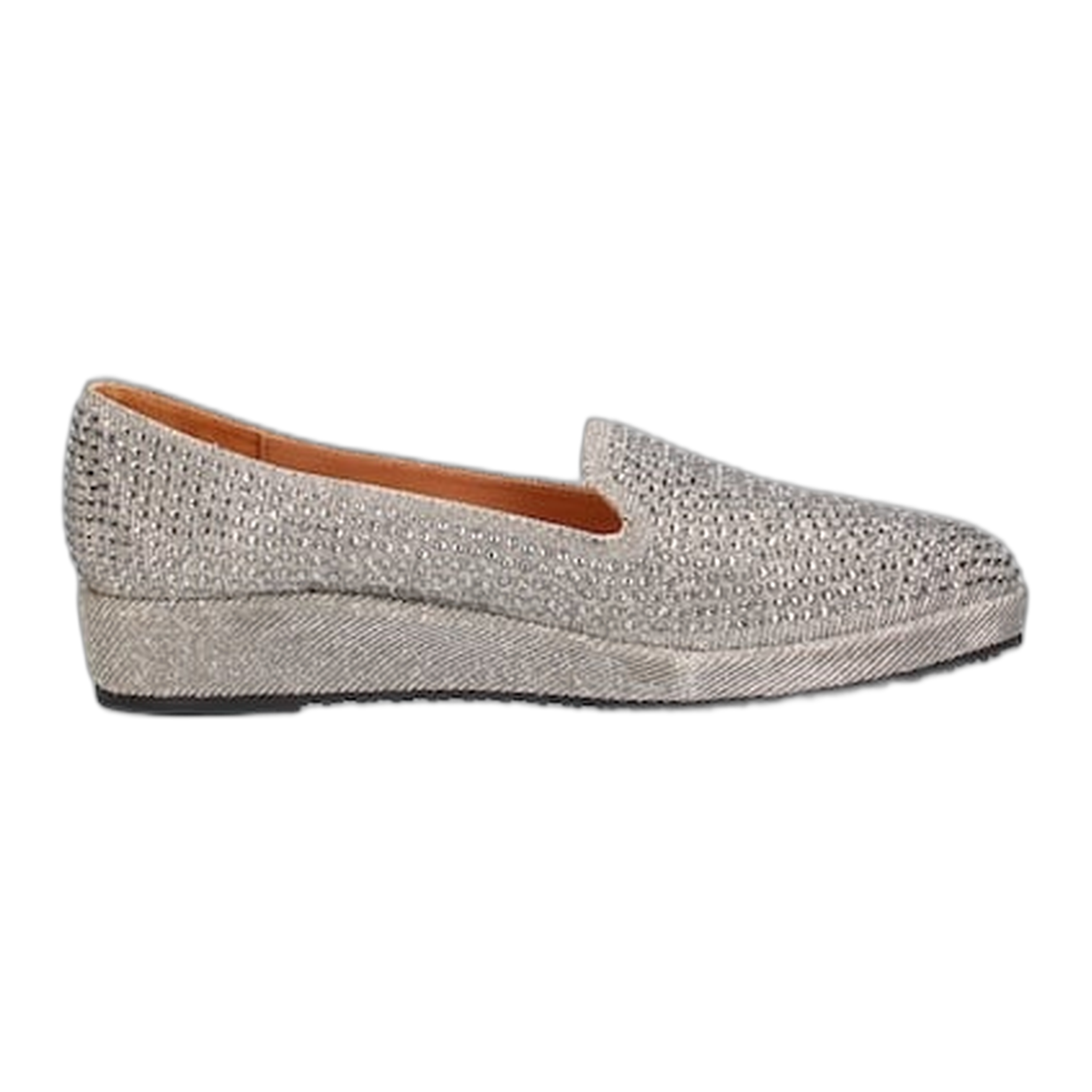 This fabric/rhinestones round toe loafer has a memory foam insole, leather lining and synthetic outsole. This slip on shoe is on a 1.25 inch heel.