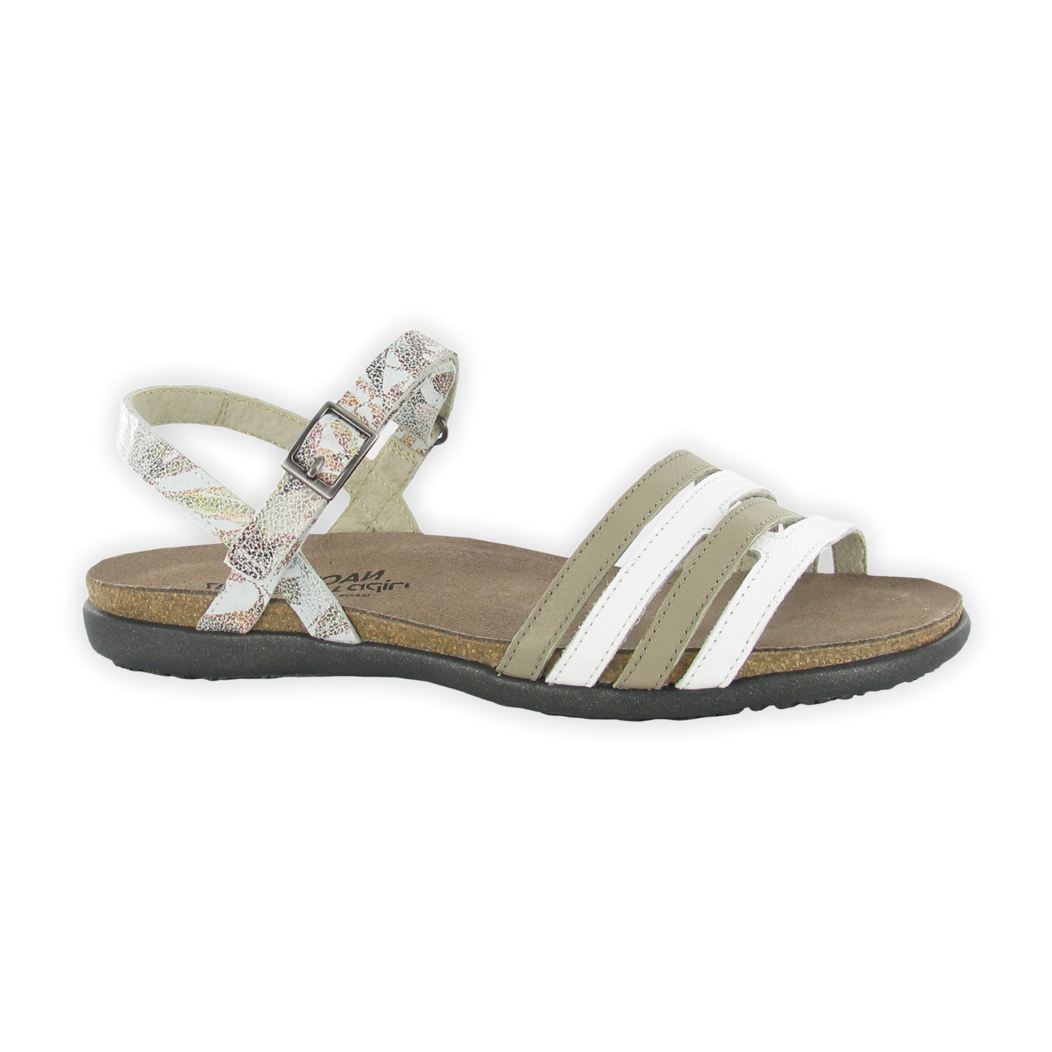The Lucy is the perfect everyday strappy sandal. Featuring a hook & loop ankle strap for adjustability. Naot's anatomic cork & latex footbed is wrapped in a pampering suede and molds to the shape of the foot with wear. The Flat Elegant Collection features a .75" TPR sole.